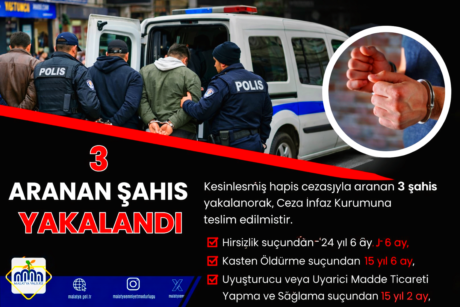 Emniyet yetkilileri, Malatya’da mevcut huzur ve güven ortamının korunması amacıyla firari suçlulara yönelik çalışmaların kararlılıkla sürdürüleceğini vurgulayarak, suçluların sokakta gezmesine müsaade edilmeyeceğini belirtti.