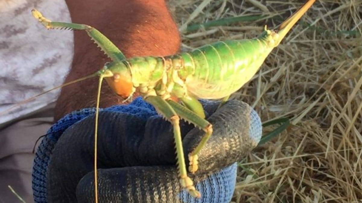 Malatya'nın Yazıhan ilçesinde Burak Kaya isimli bir vatandaş arazisini kontrol etmek için yola koyulunca dev bir çekirgeye rastladı. Daha önce de bu türden çekirge gördüğünü belirten vatandaş, ilk defa bu kadar büyük ve renkli çekirge gördüğünü söyledi.