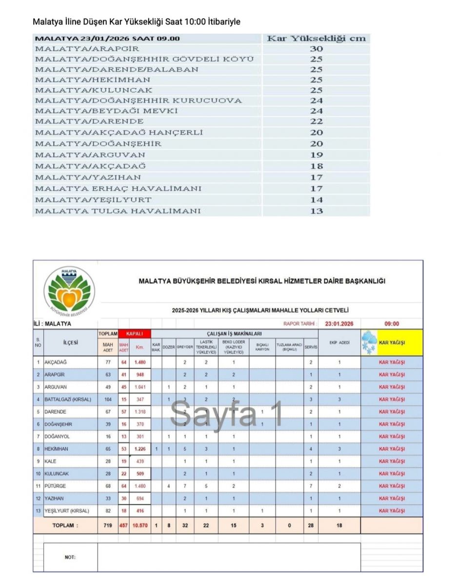 Belediyesinin 23.01.2026 tarih 09:00 itibariyle 457 kırsal mahale yolu toplamda 10.570 km yol kapalı bulunmakta olup, açma çalışmaları devam etmektedir.