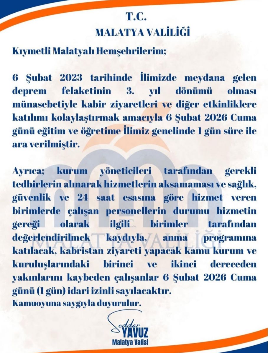 Valilikten yapılan açıklamada, depremde hayatını kaybeden vatandaşların kabir ziyaretleri ve anma etkinliklerine katılımın kolaylaştırılması amacıyla 6 Şubat 2026 Cuma günü Malatya genelindeki tüm eğitim kurumlarında eğitime ara verildiği belirtildi.