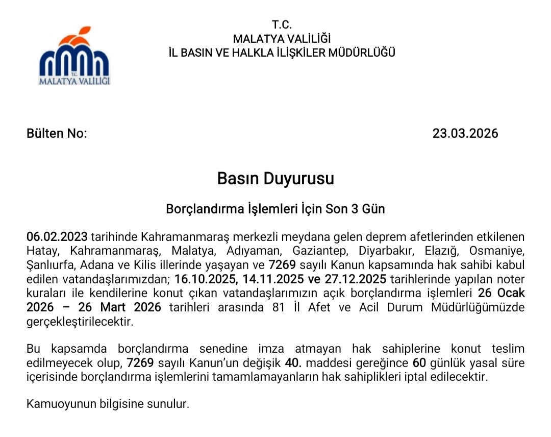 Açıklamada, borçlandırma senedine imza atmayan hak sahiplerine konut teslim edilmeyeceği vurgulanırken, 7269 sayılı Kanun’un 40. maddesi gereğince 60 günlük yasal süre içinde işlemlerini tamamlamayan vatandaşların hak sahipliklerinin iptal edileceği bildirildi.