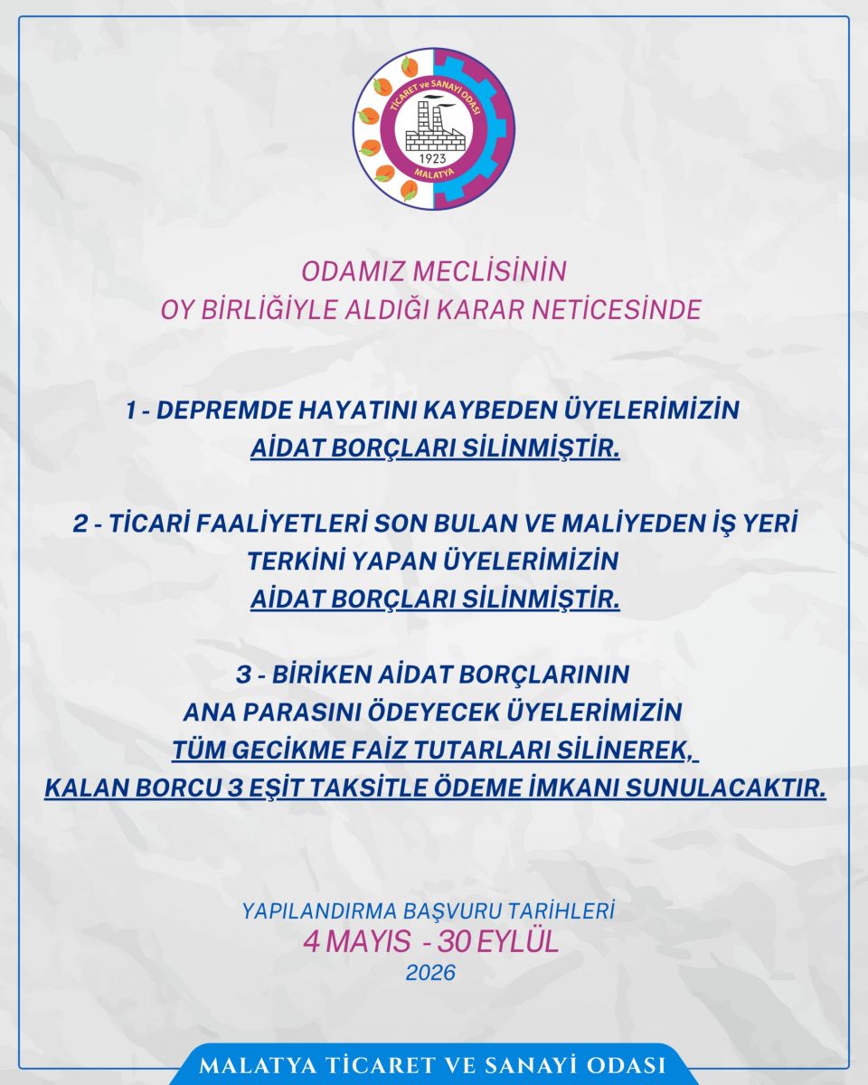 Aldıkları kararla ilgili açıklama yapan MTSO Yönetim Kurulu Başkanı Oğuzhan Ata Sadıkoğlu, şunları söyledi: “Deprem sadece fiziki yıkıma yol açmadı, aynı zamanda üyelerimizin nakit akışını, üretim gücünü ve ticari sürekliliğini de ciddi şekilde etkiledi. Bu süreçte üyelerimizin ayakta kalabilmesi en büyük önceliğimiz oldu. Meclisimizde aldığımız bu kararla, hem vefat eden üyelerimize karşı vefa borcumuzu ödemeyi hem de işini sürdürmeye çalışan üyelerimize nefes aldırmayı hedefledik. Bu kararı uzun zamandır almak istiyorduk, ancak TOBB ve bakanlıklarla yapılan resmi görüşmeleri ve hukuki süreci ancak tamamlayabildik. Ekonomik toparlanmanın yolu, üyelerimizin yeniden güçlenmesinden geçiyor. Oda olarak her zaman üyelerimizin yanında olmaya devam edeceğiz.”